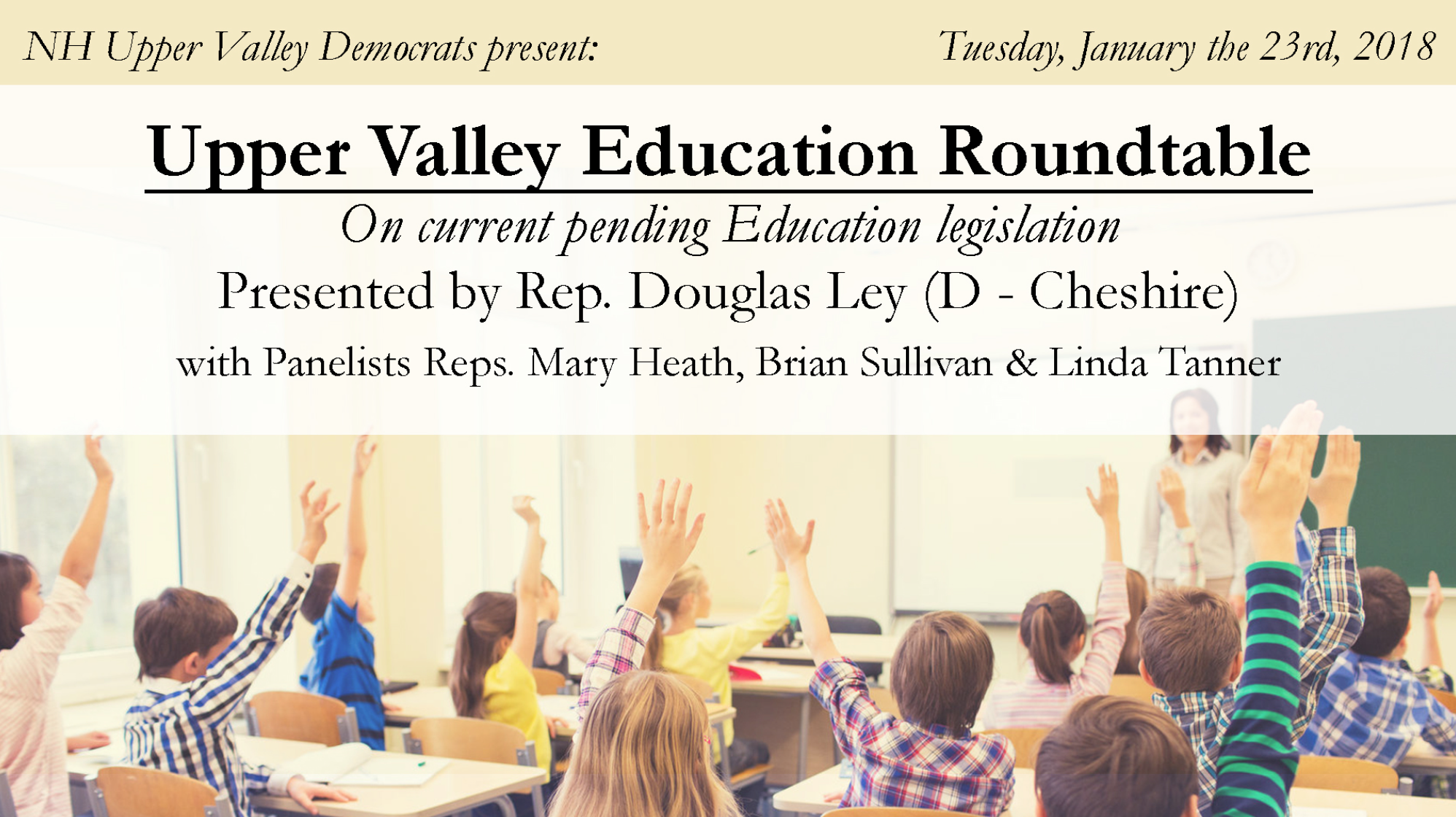 A panel of state representatives will explain the potential consequences of education legislation introduced in the New Hampshire State Legislature. Significant education bills are being debated and acted upon over the next two months. In anticipation of the contentious debate surrounding this legislation, the New Hampshire Upper Valley Democrats are launching their 2018 Upper Valley Lecture Series on Tuesday, January 23, 2018, with a roundtable of House Representatives who will outline the content of proposed education bills, provide a history of legislative genesis, and offer guidance for grassroots intervention. Funding for the Upper Valley Lecture Series was provided by the New England Grassroots Environment Fund.