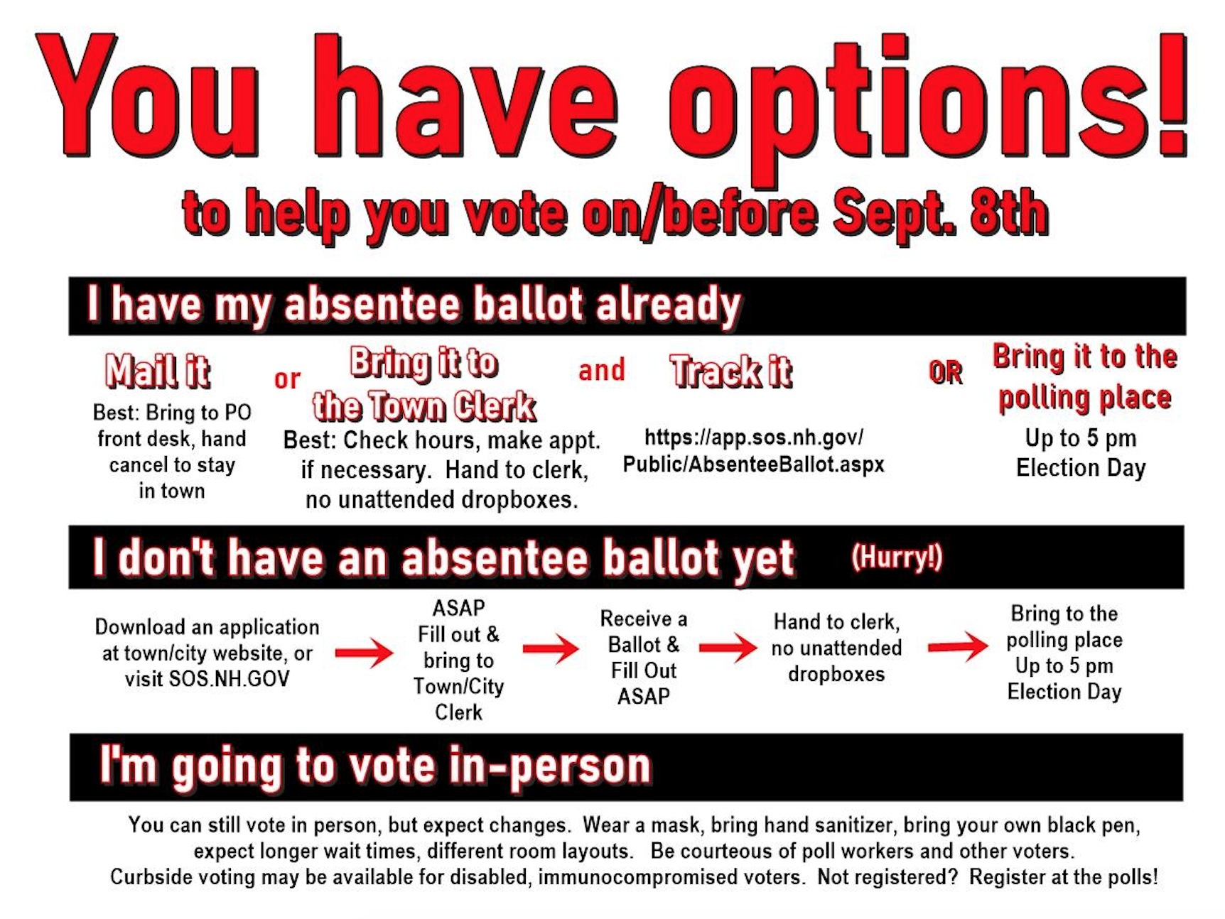 https://sos.nh.gov/media/rs0ly4xu/absentee-ballot-app-8-20-covid.pdf and hand-deliver the application to your town clerk. When you hand it in, consider asking for the ballot at that time to fill it out and turn it back in. Check your town clerk’s hours below.