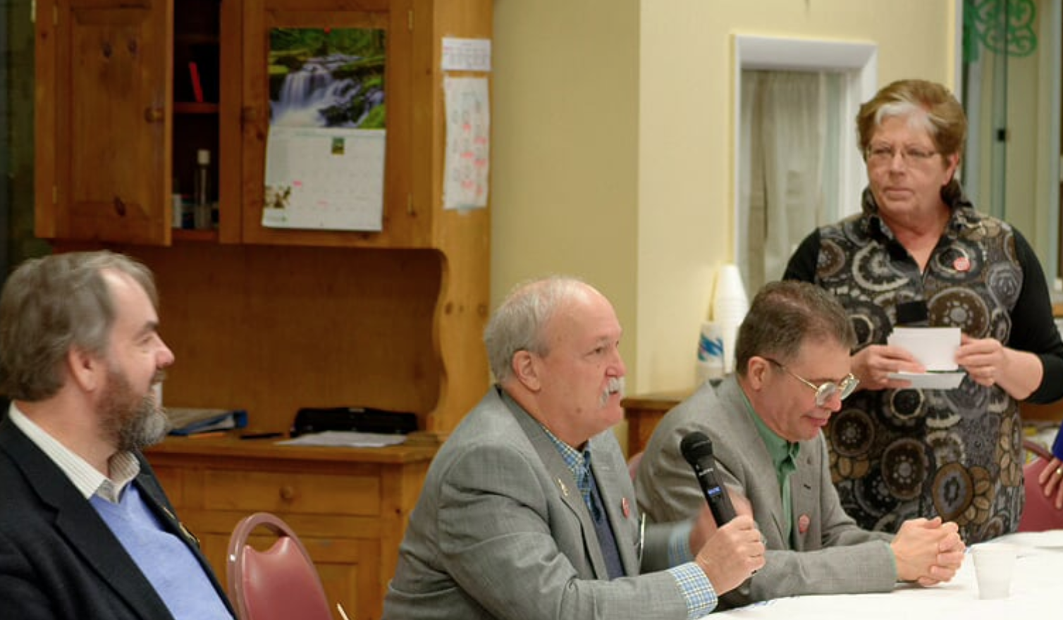 Facilitator Rep. Jackie Cilley (standing) asks panel what their priorities are in November. Rep. George Sykes (center), responds with investing in transportation infrastructure. Rep Kermit Williams (left) is focused on getting and keeping a Democrat majority for the 2020 redistricting. Rep. John Cloutier spoke of raising minimum wages and Rep. Cilley would focus on young workforce development.